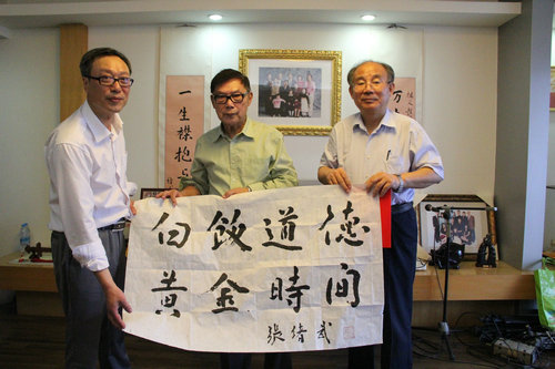 日前,原全国政协常委、原全国工商联常务副主席、我校董事会名誉董事长、张謇嫡孙张绪武在南通亲切会见扬大淮扬文化研究中心主任周新国教授一行,就编纂《张謇辞典》、学校历史沿革等内容接受访谈。期间,张绪武应邀题写“白饭道德、黄金时间”一联,赠予学校档案馆。该联取自我校创始人张謇先生为其子张孝若(南通学院创办人)所题,旨在勉励后辈注重道德修养,珍惜青春时光,彊勉学问,彊勉行道,修身齐家,报效祖国。